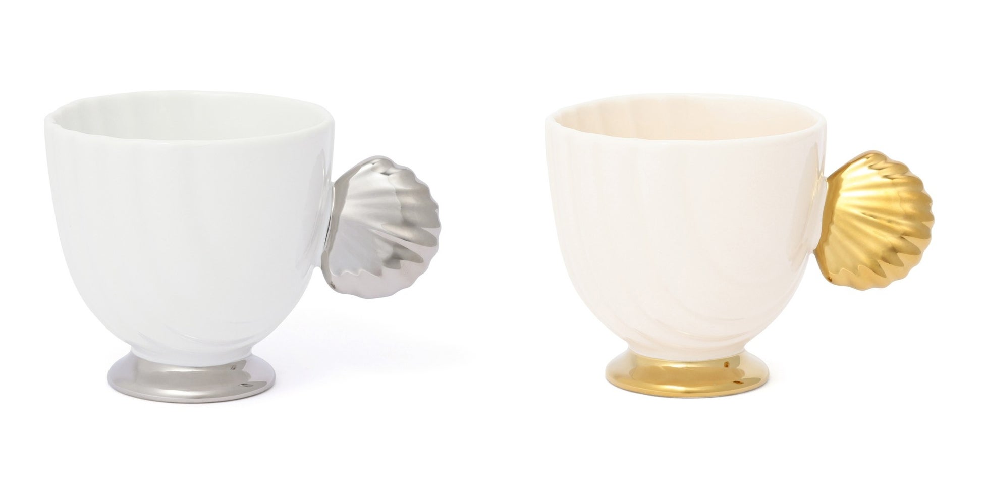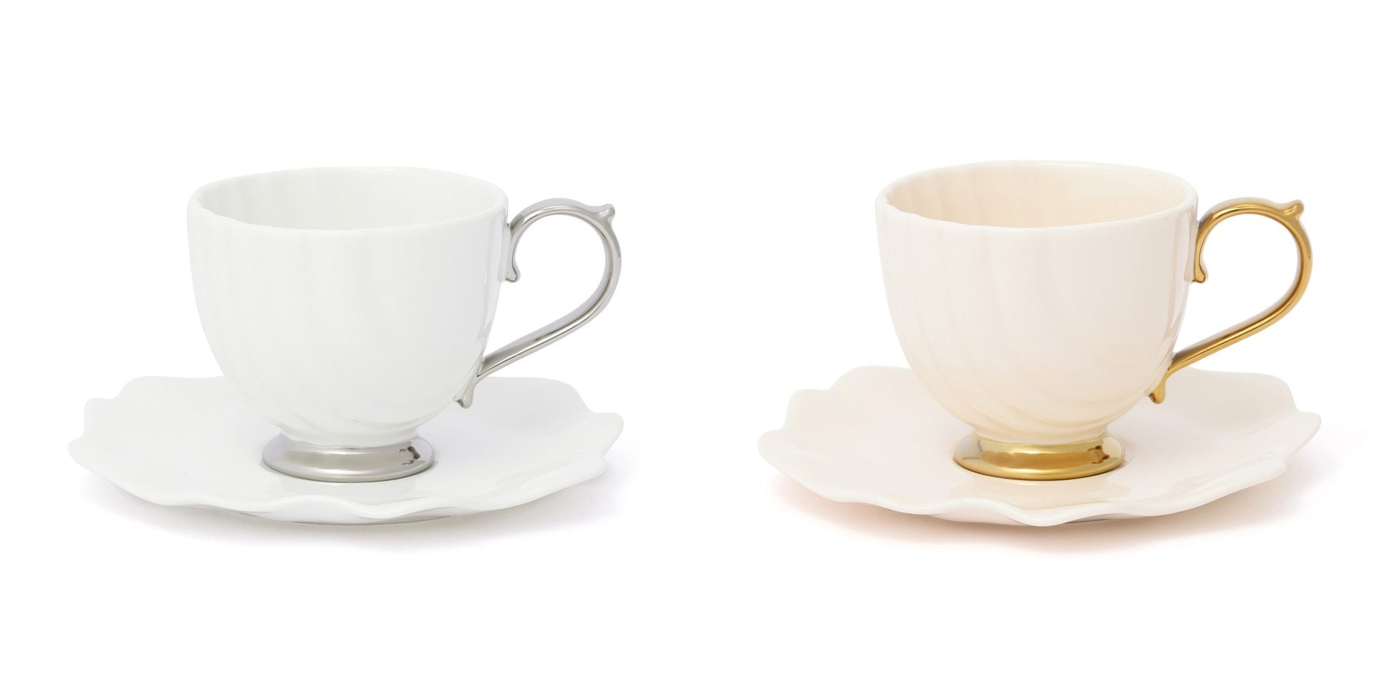 カップは貝殻の繊細なラインと立体感を取り入れたデザインで、ソーサーは波のかたちをモチーフにした優雅なフォルムが特徴です。