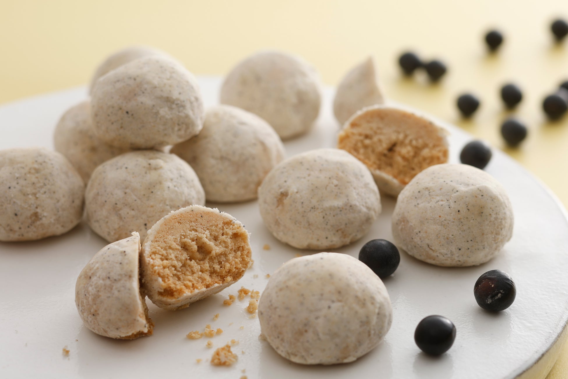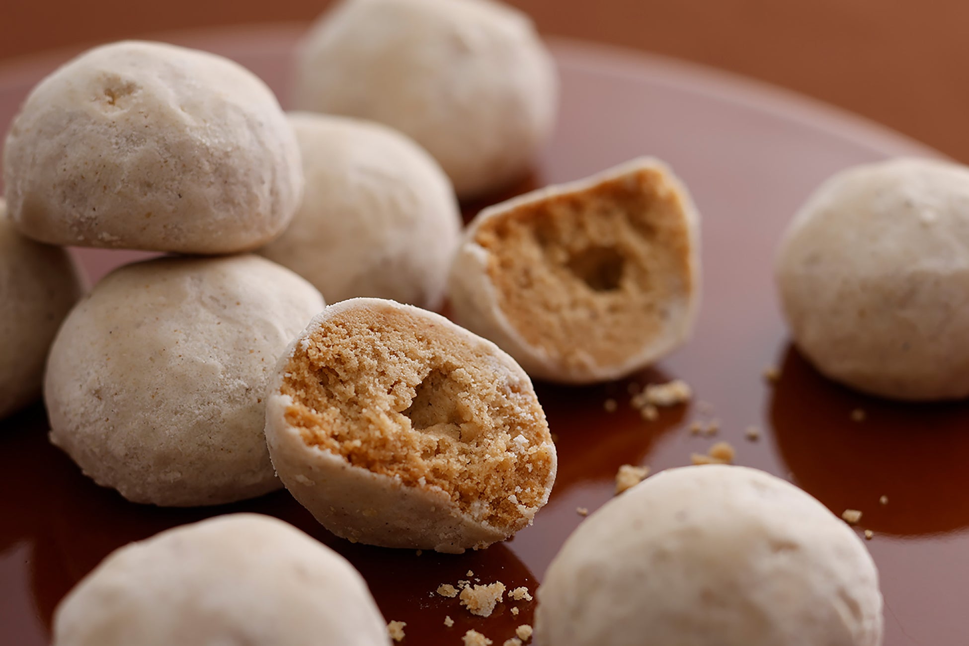 ブールドネージュはフランス語で「雪の玉」という意味のお菓子で、雪のように粉糖をまぶしてあるのが特徴です。アーモンドを練り込んだ生地に粉糖をたっぷりまぶしたサクサクほろほろの食感は食べだしたら止まらない美味しさです。「きなころろん」は仕上げに丹波黒のきなこパウダーをまぶしてあります。