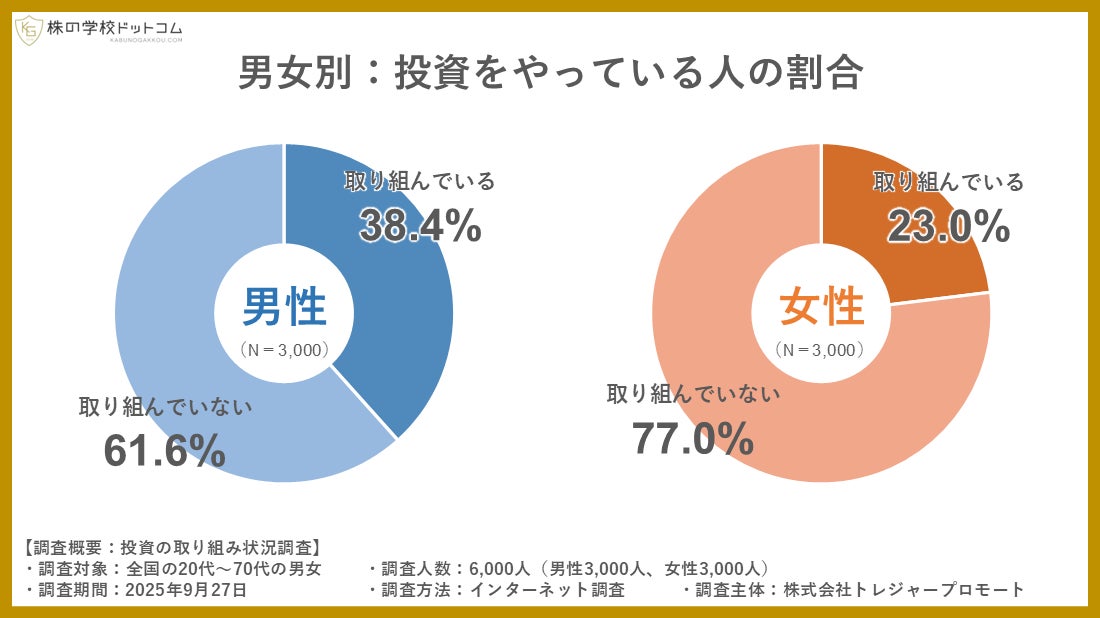 男女別に分析してみると、男性で投資に取り組む人は38.3%だったのに対して、女性では23.0%に留まりました。男性は女性の約1.7倍という結果で、その差は決して小さいとは言えません。