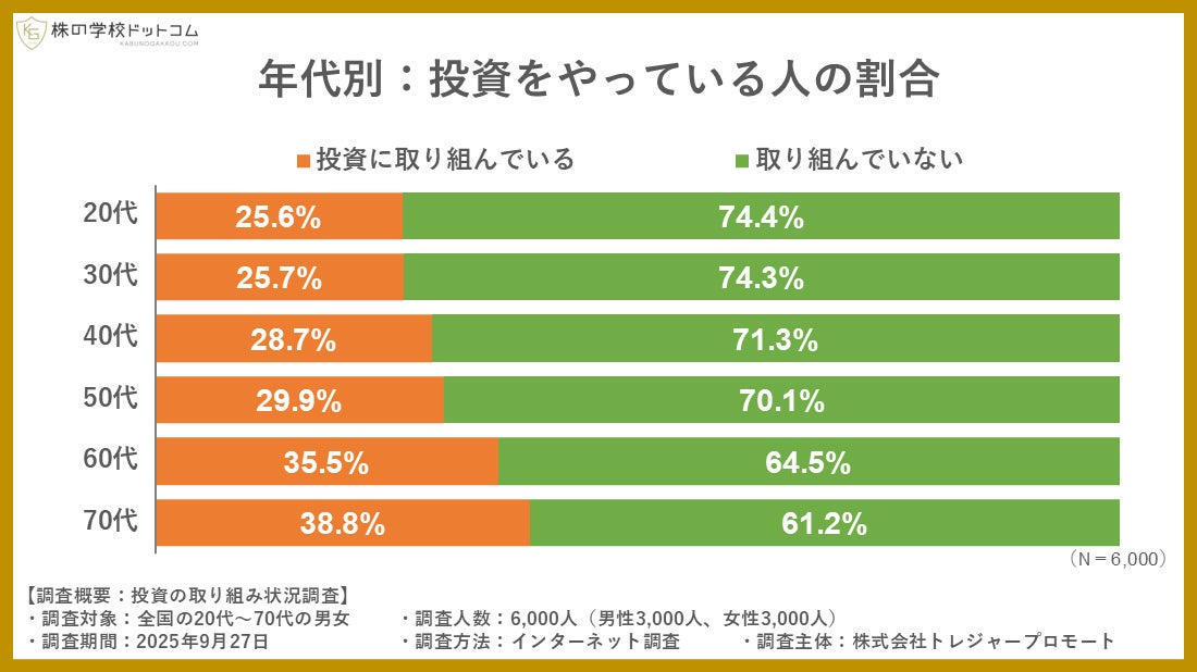 10月4日は「投資の日」です。オンライン株式スクール「株の学校ドットコム」(運営会社:株式会社トレジャープロモート、東京都千代田区、代表取締役社長:瀬川 丈)では、全国の6000人を対象に投資活動への取り組みについて調査しました。