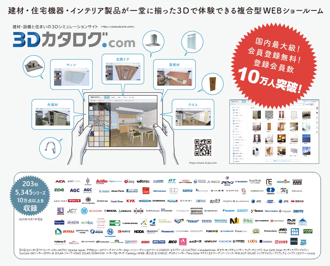 福井コンピュータアーキテクト株式会社(本社:福井県坂井市、代表取締役COO:坪田 信)が運営する複合型WEBショールーム 建材・設備と住まいの3Dシミュレーションサイト「3Dカタログ.com(https://www.3cata.com/)」は、2025年10月5日に 登録会員数10万人(※2)を突破しました。これもひとえに、日頃よりご利用いただいている皆様のご支援の賜物です。
