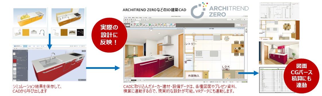 3Dカタログ.com上でシミュレーションした3D建材・設備データを3D建築CADシステム「ARCHITREND ZERO」をはじめとした弊社CADに取込み、各種図面やプレゼン資料、積算など実際の設計に活用!お客様に具体的な完成イメージを伝えることができます。