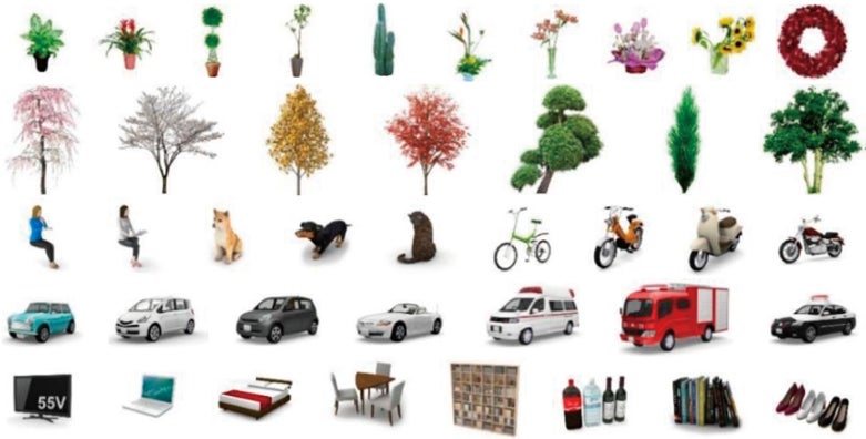 CADによる設計図面やCGパースに、さらに現実味を持たせることができるハイクオリティーな添景データコンテンツです。自動車や植栽、食器などの小物類が多数収録されています。