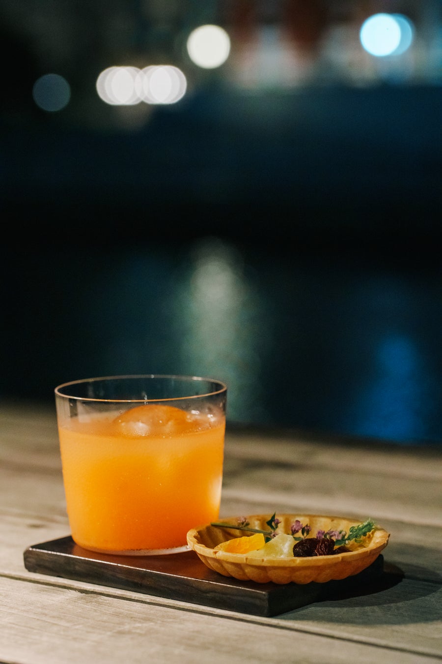 [写真左]アペロールスピリッツを日本酒”酒界先導師”でツイスト。アペロールと微発砲の甘口日本酒の組み合わせが先進性を示す優しいスイートカクテルに。まるで甘味処でのひと時を演出できるあしらいとご一緒にお楽しみ下さい。