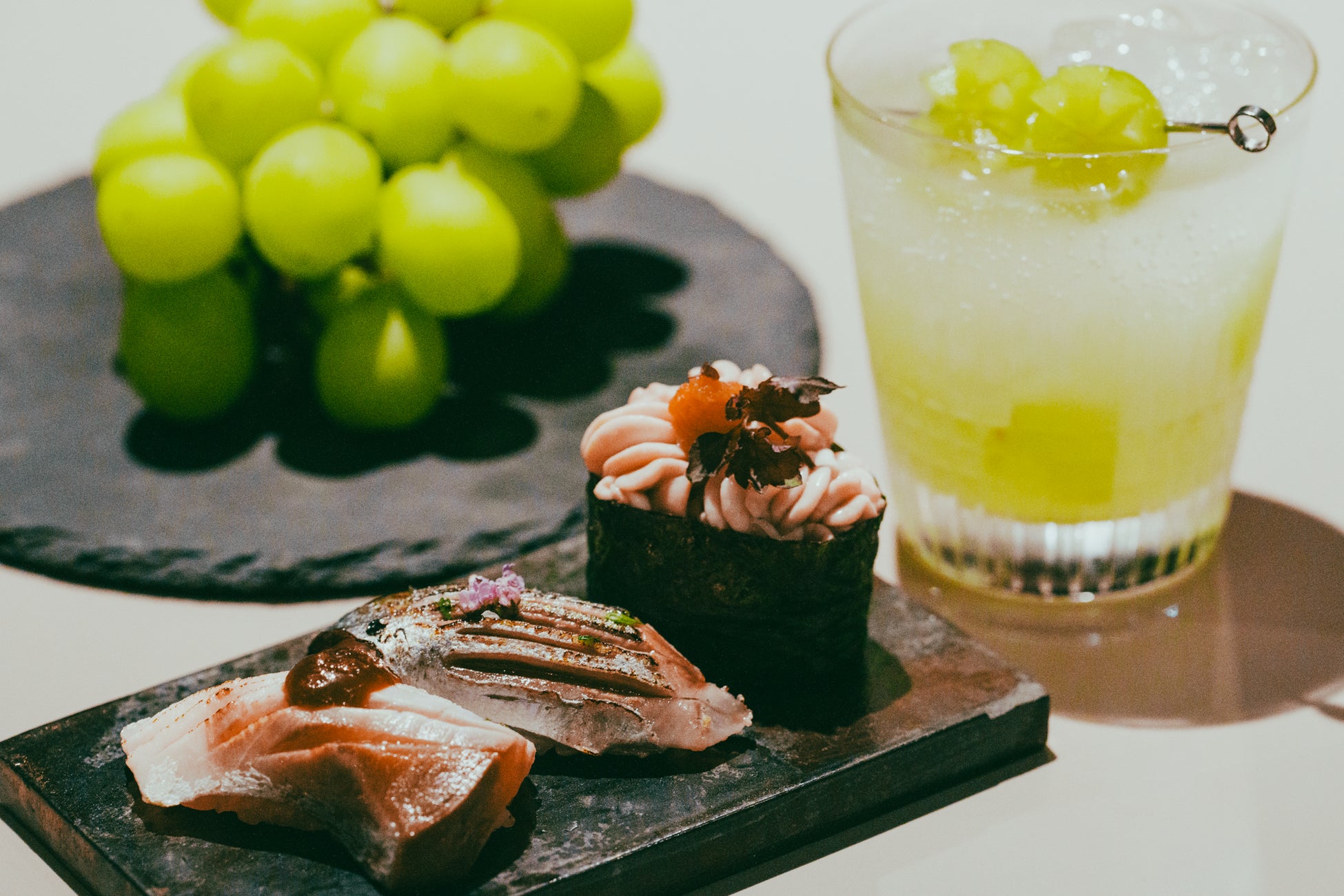 BAR SHIMIZUにて秋に提供しているシャインマスカットのフルーツカクテルとTOSAの創作握り3貫を合わせました。シャインマスカットの爽やかな酸味と脂が乗った秋の旬魚がマッチした秋の味覚を味わい尽くすペアリングセットです。