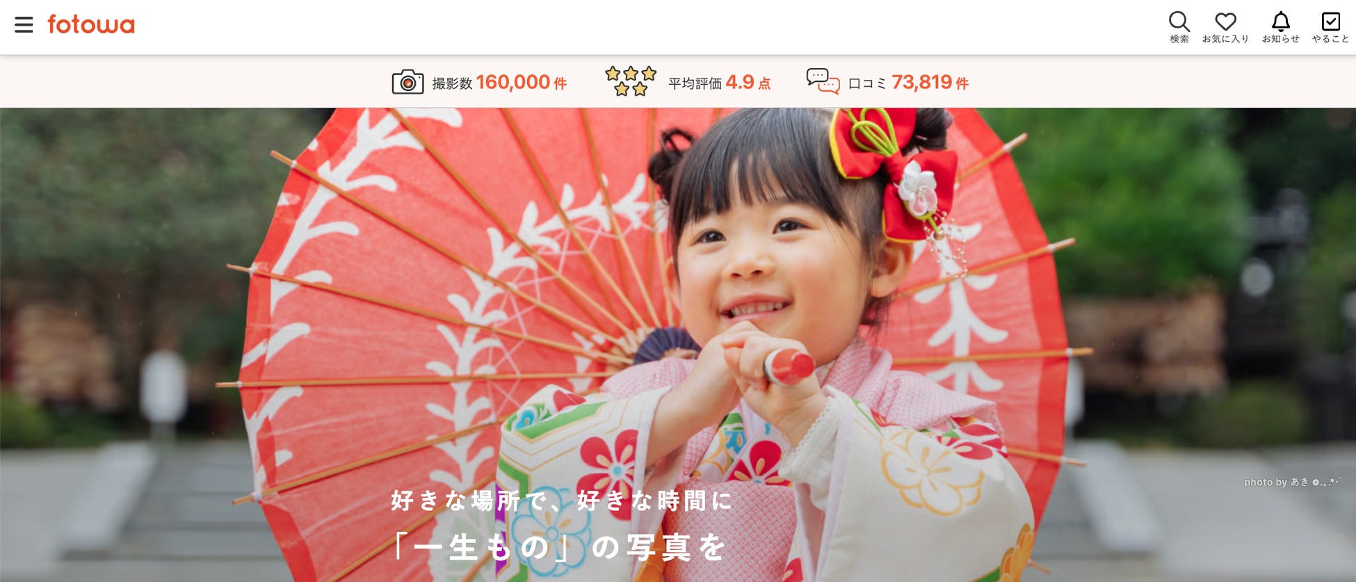 「fotowa」は、撮影して欲しい人とプロのフォトグラファーをつなぐ、家族・子ども向けの出張撮影プラットフォームです。シンプルな料金設計と、好きな場所に好きな作風のフォトグラファーを指名して撮影予約ができるのが特徴。
