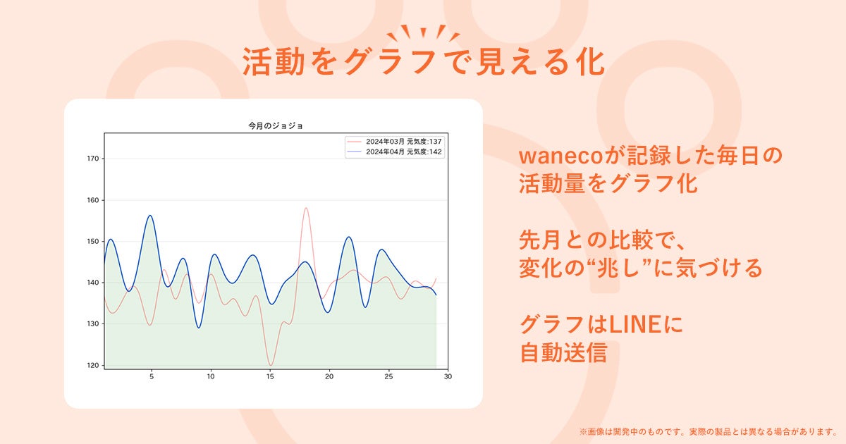 活動量がひと目でわかる「アクティビティグラフ」機能を新搭載し、定期的に活動量グラフが提供されます。ペットの状況を細やかに予測する手助けとしてご利用になれます。