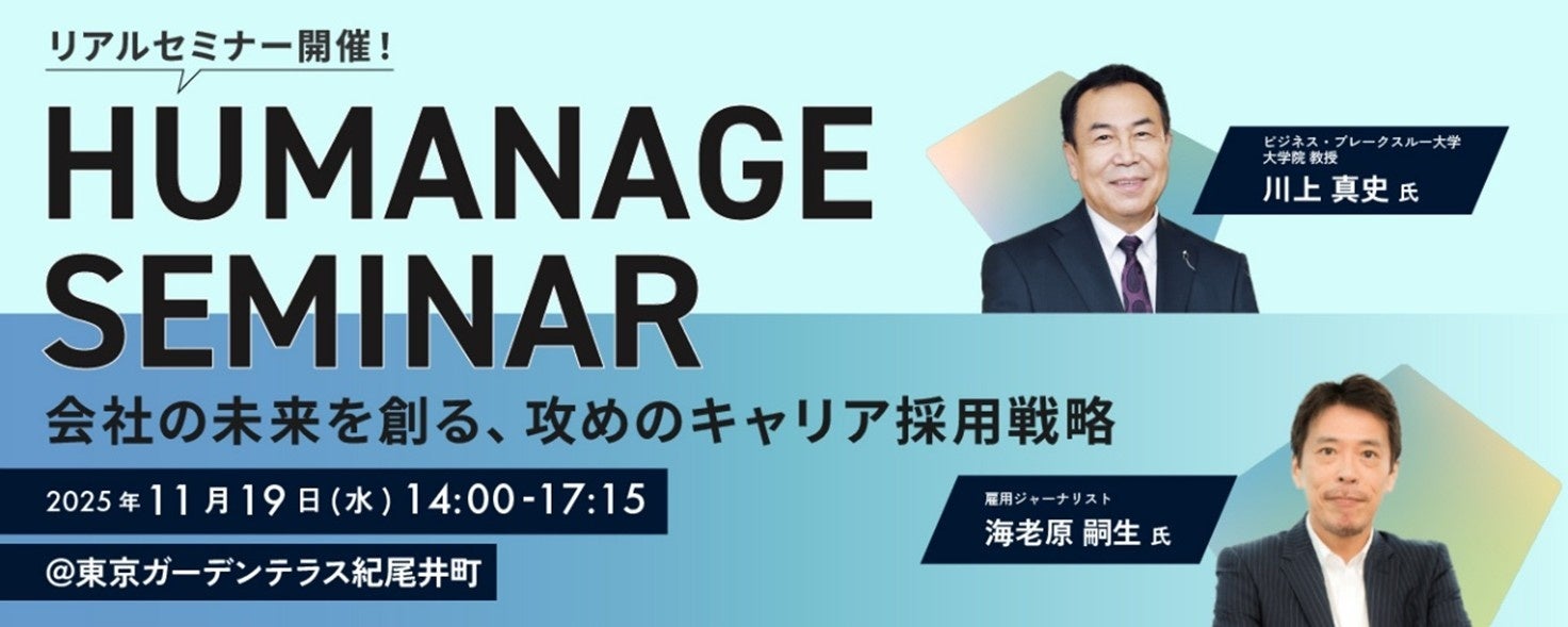 人材の“採用”から“定着”、その先の“活躍”までを支援する人材サービス事業を展開する株式会社ヒューマネージ(本社:東京都千代田区、代表取締役社長:齋藤 亮三)は、2025年11月19日(水)、人事・採用ご担当者様向けセミナー『会社の未来を創る、攻めのキャリア採用戦略』を開催いたします。