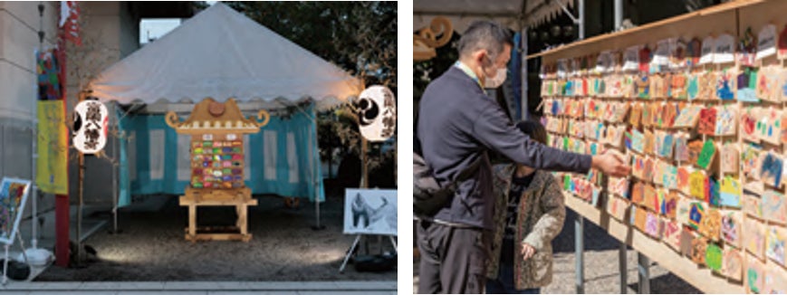 江東区内の障がいのある子どもたちや福祉施設に通う方たちに、それぞれの想いを込めて自由に描いてもらった1,300枚以上のアート絵馬が、富岡八幡宮に飾られます。色とりどりの絵馬が飾りつけられた絵馬ボードの中心には「みんなのアート絵馬神輿」が展示されています。アートパラ深川おしゃべりな芸術祭のシンボルになっている「小さな芸術家たち」が描いたアート絵馬です。