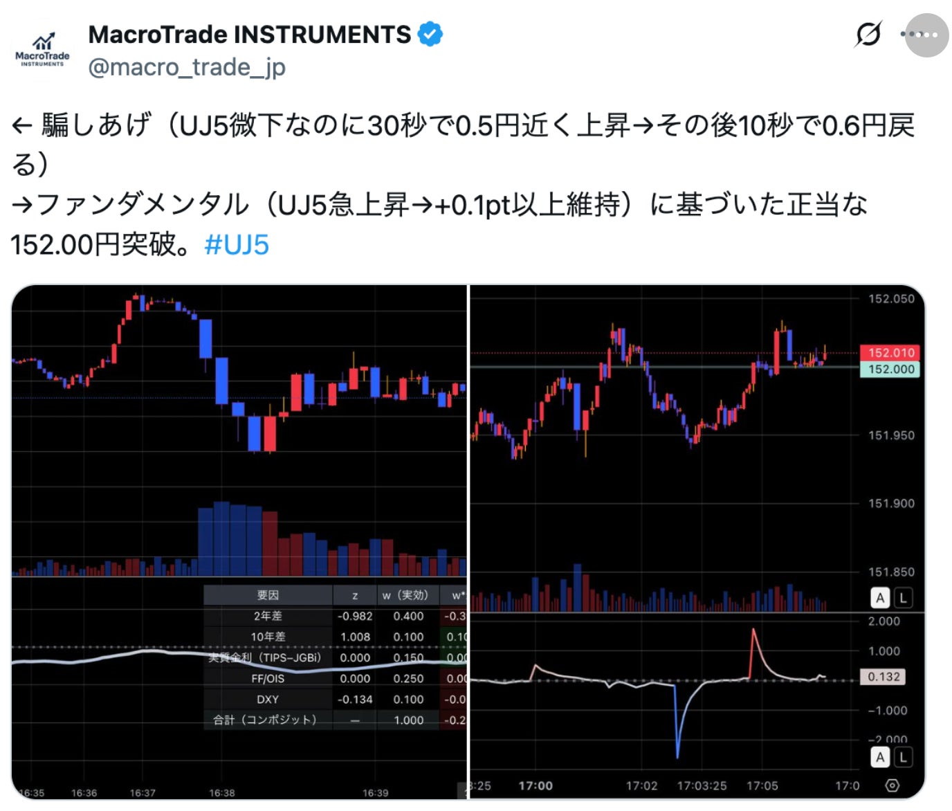 東京(2025年10月15日)— MacroTrade INSTRUMENTS(https://macrotrade-instruments.jp)は、USD/JPYの値動きを左右するマクロ要因を一本化した複合指数「UJ‑Macro5©︎(以下、UJ5)」を公開した。
