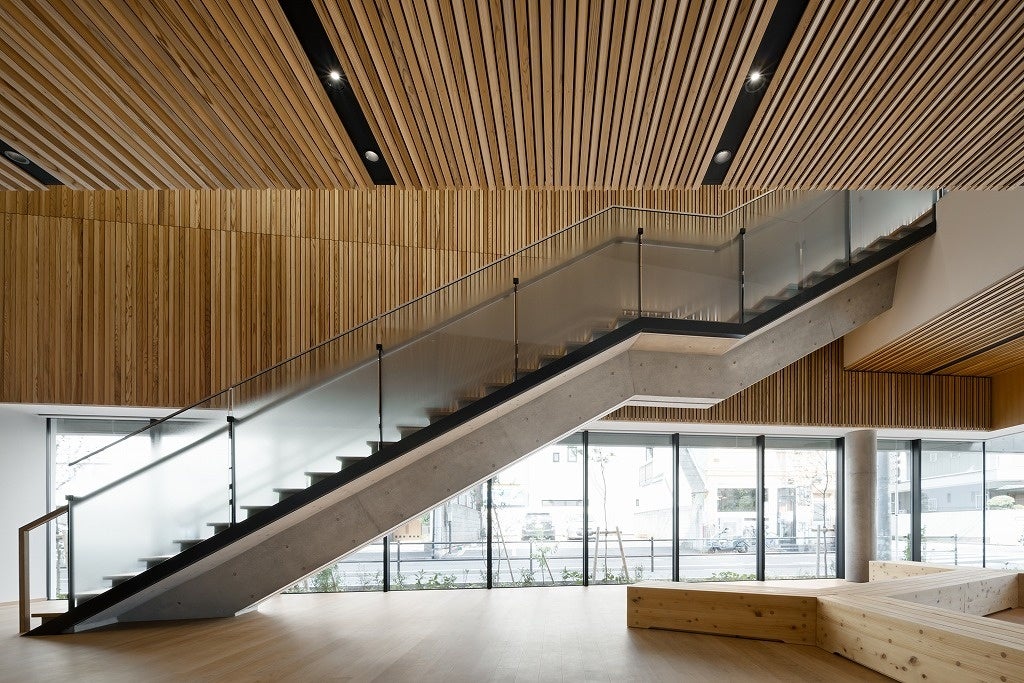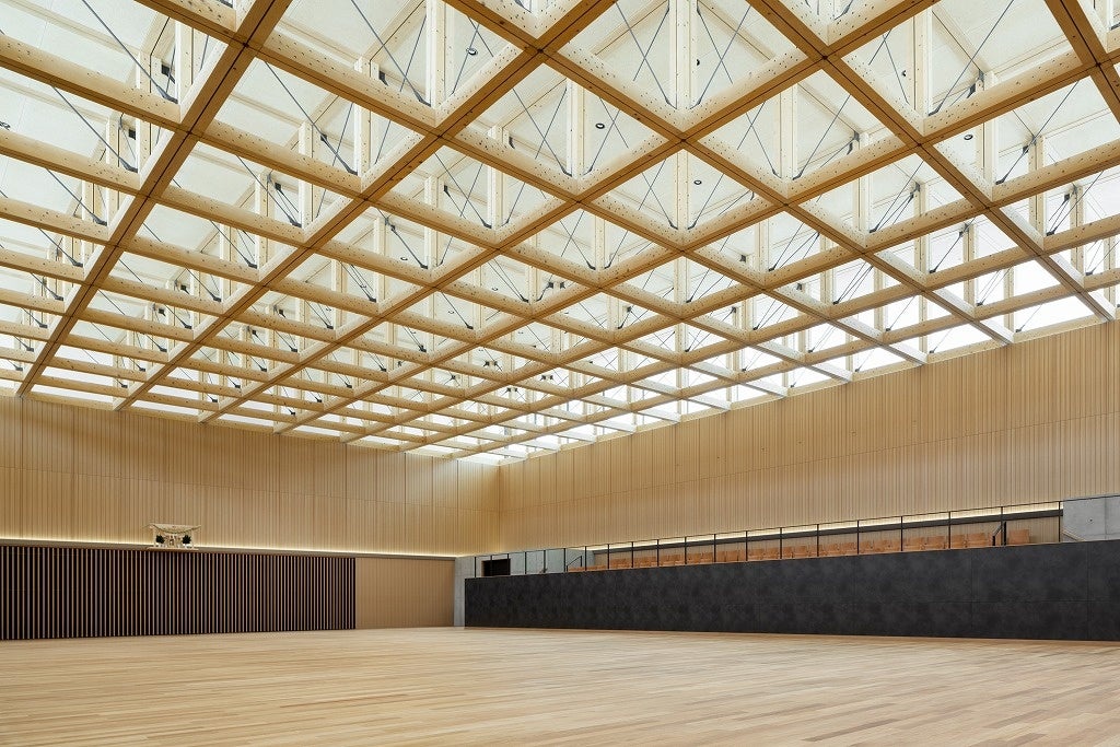 構造面では、鉄筋コンクリート造(RC造)、鉄骨造(S造)・一部木造を組み合わせ、耐震性と快適性を確保。屋根には木造トラスを用い、自然光を取り入れるトップライトを設けることで、日中の照明使用を抑え、省エネルギー化を実現しています。また、国産木材や間伐材を積極的に活用し、環境負荷低減にも寄与しています。