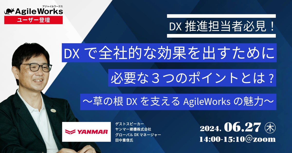 ワークフローソリューションベンダーであるエイトレッド(本社:東京都渋谷区、代表取締役社長:岡本 康広 以下、エイトレッド)が開発・提供するワークフローシステム「AgileWorks(アジャイルワークス)」のユーザー企業であるヤンマー建機株式会社にご登壇いただき、オンラインセミナー『<DX推進担当者必見>DXで全社的な効果を出すために必要な3つのポイントとは ~草の根DXを支えるAgileWorksの魅力~』を2024年6月27日(木)に開催いたします。