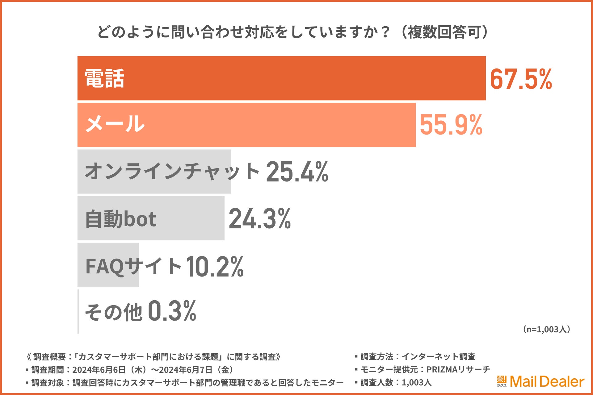 今回の調査結果で、カスタマーサポート部門では電話やメールで問い合わせ対応を行っている方が多いことが判明しました。