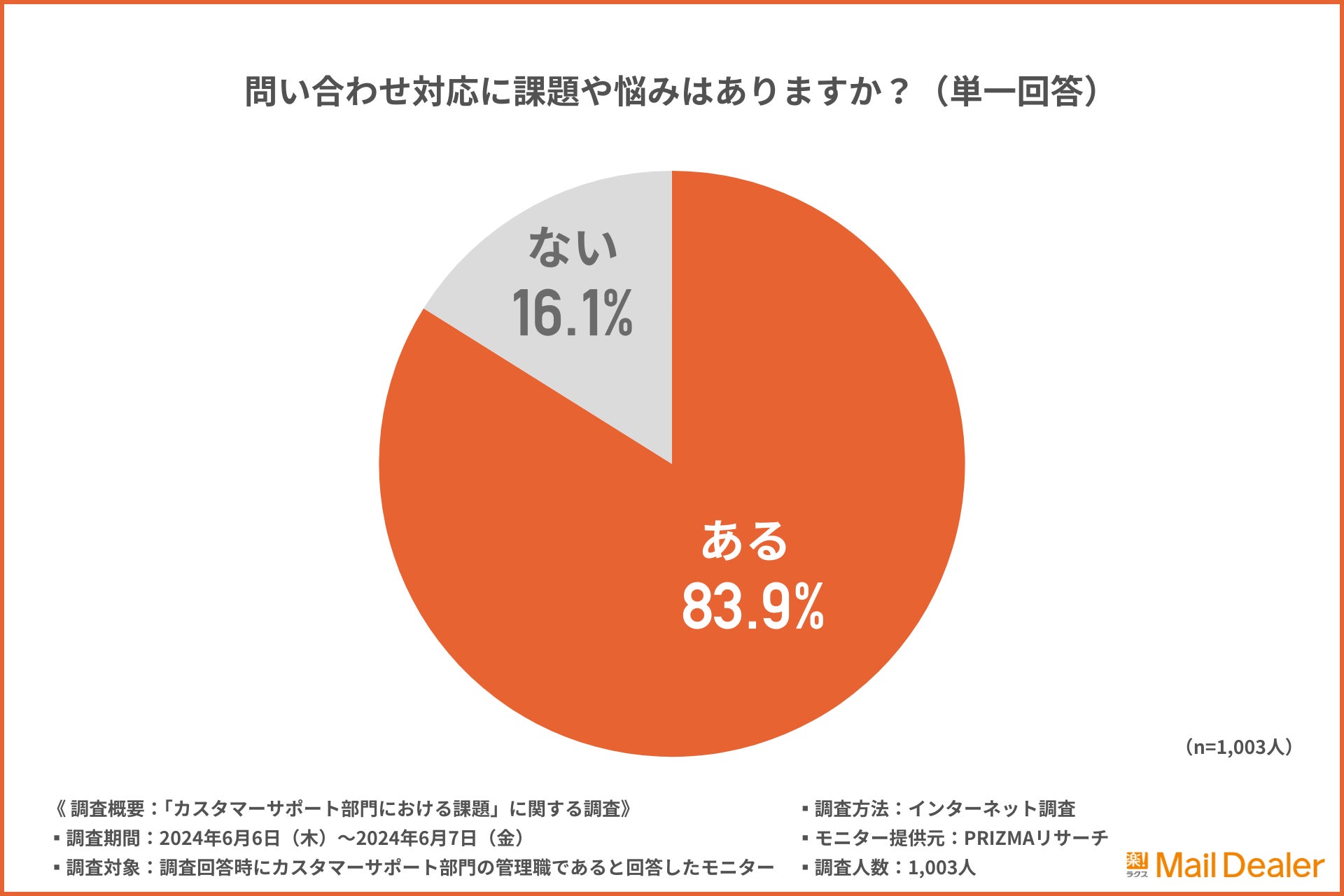 そこで、「問い合わせ対応に課題や悩みはありますか?(単一回答)」と質問したところ、8割以上の方が『ある(83.9%)』と回答しました。