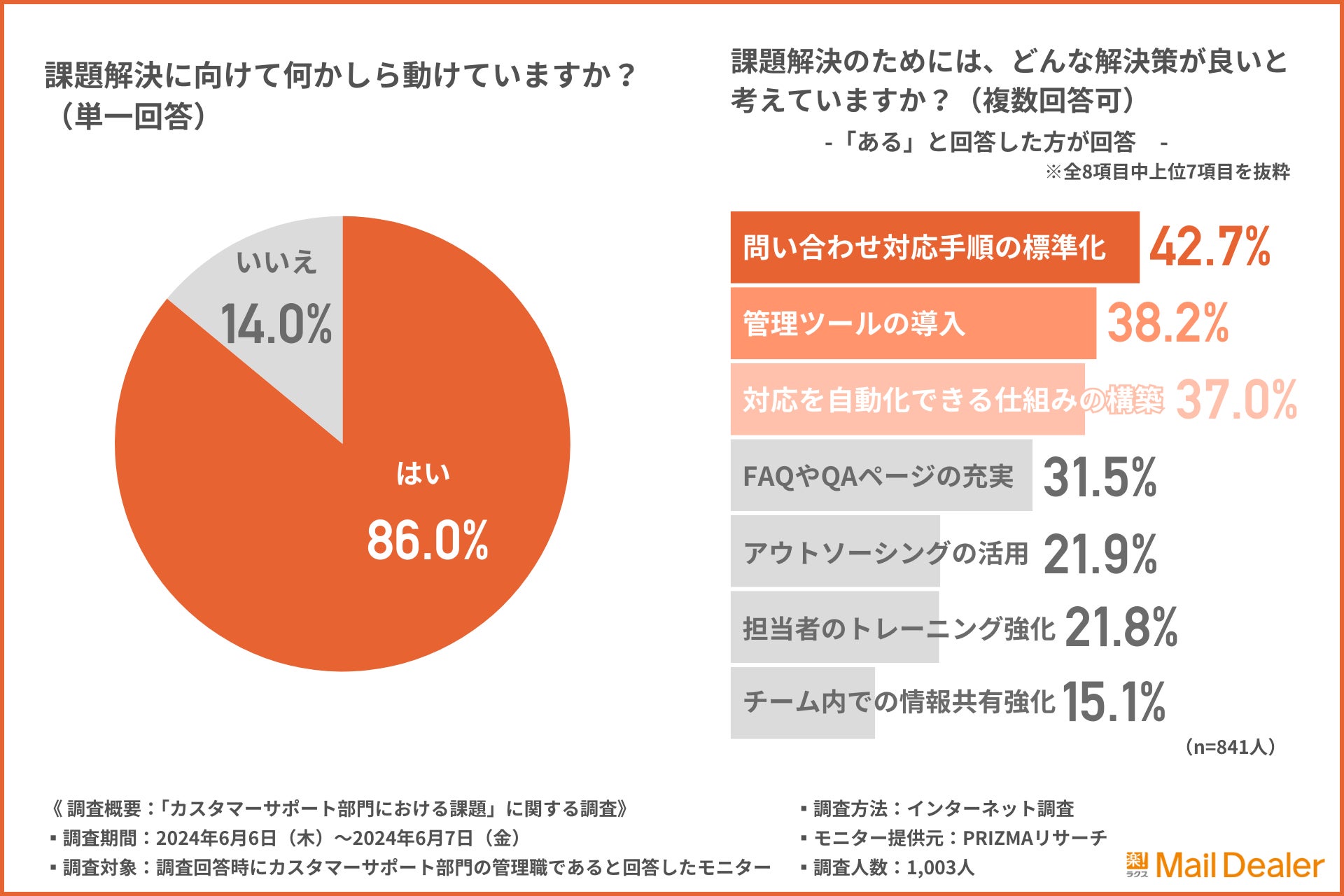 問い合わせへの対応手順を標準化することや管理ツールの導入、対応を自動化できる仕組みを構築するといった対策が課題解決には良いと思うことが示されました。