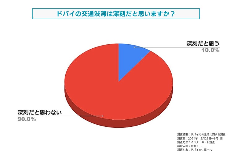 一方、90%の回答者は、ドバイの交通渋滞は深刻ではないと回答しました。多くの回答者は、都市のインフラが整備されており、交通量が多い時間帯でも比較的スムーズに移動できることを評価しています。また、公共交通機関の利用や柔軟な勤務時間の設定が、渋滞の緩和に寄与していると感じている人も多いです。