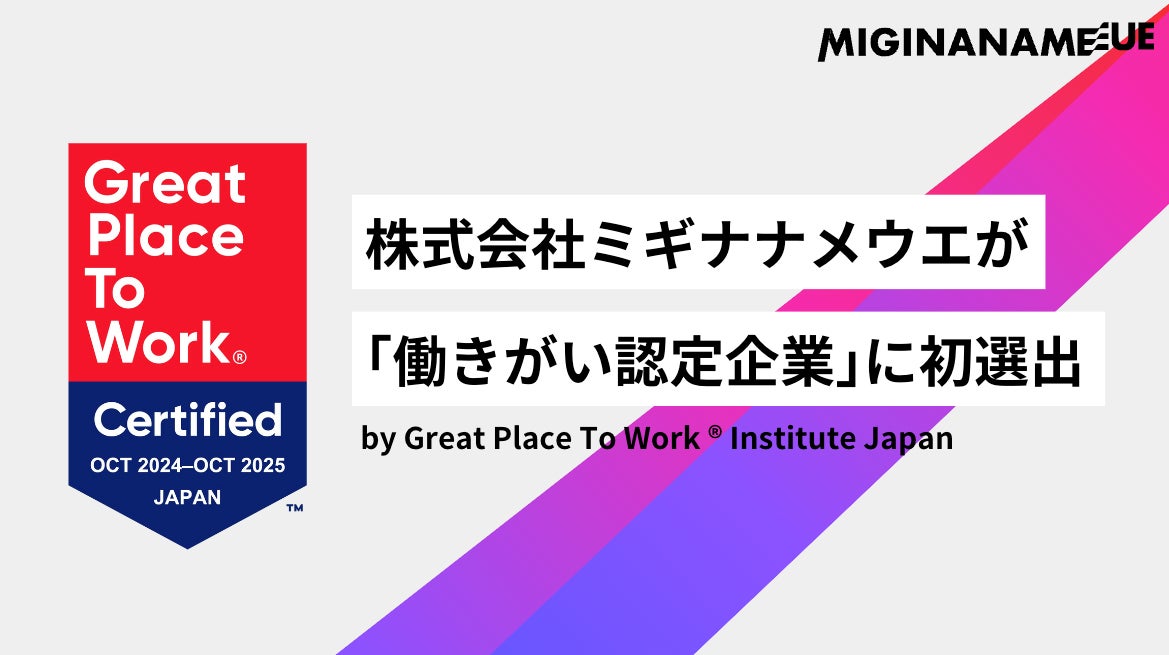 「即戦力PRO」「よりそい転職」などの人材事業を運営する株式会社ミギナナメウエ(本社:東京都渋谷区、代表取締役CEO 古鍜冶 賢)は、Great Place To Work® Institute Japan(以下 「GPTW」)が調査、実施する2025年版 「働きがいのある会社」認定において初選出されました。
