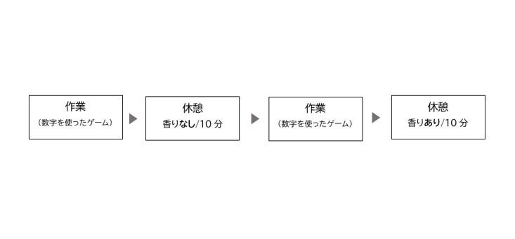 ・実験結果:香りを噴霧して、香りがある中で休んだ2回目の休憩時の方が、香りなしの休憩時と比べ、集中と覚醒の度合いが高く、持続する結果となりました。