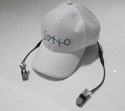 「Sotto ブレイン」を搭載した脳波測定デバイスでは、額と耳たぶに「Sotto ブレイン」を装着することにより、脳波を測定します。測定した脳波は、スマートフォンのアプリにて表示されます。
