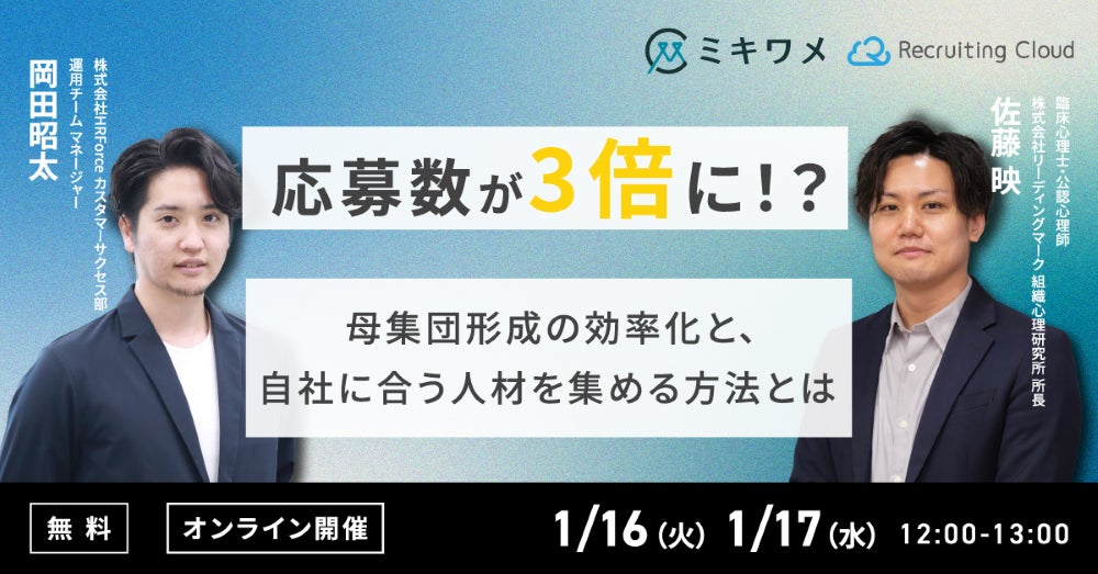 Personality Techを通じたHR事業「ミキワメ」を提供する株式会社リーディングマーク(本社:東京都港区、代表取締役社⻑:飯⽥ 悠司)は、求人広告運用ツール「Recruiting Cloud」を提供する株式会社 HR Force(本社:東京都千代田区、代表取締役社長:村田 泰子氏)と2024年1月16、17日にて、「母集団形成の効率化と質の向上」にまつわるオンラインセミナーを開催します。