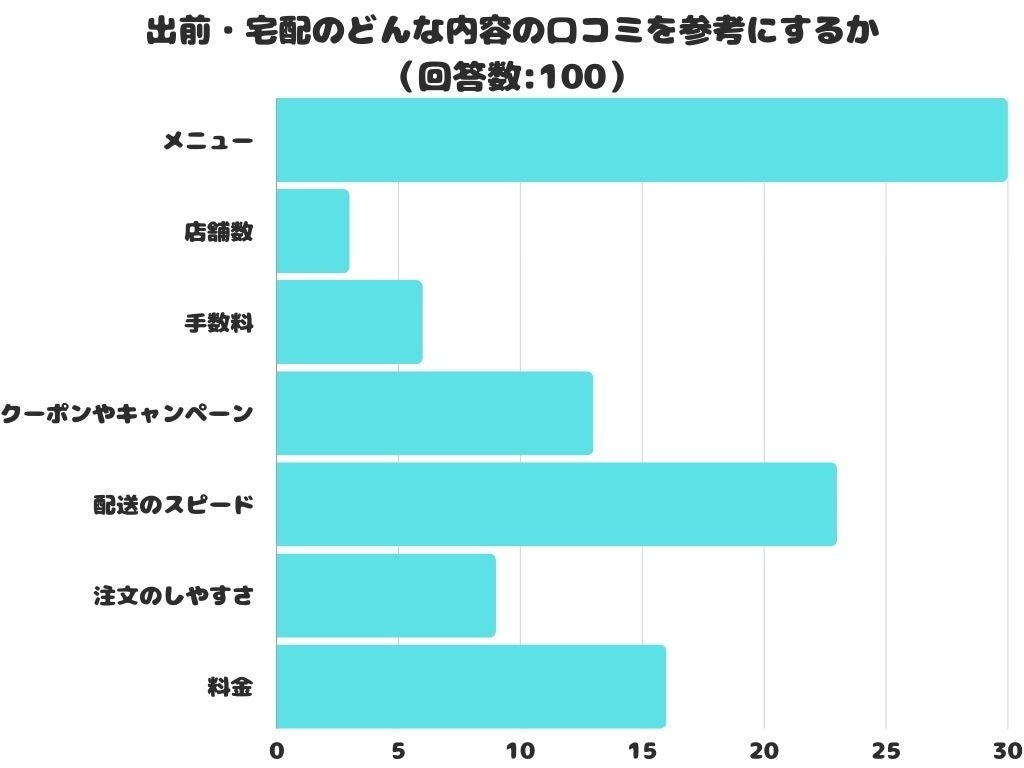 出前・宅配のどんな内容の口コミを参考にするかをアンケートにて調査したところ、1位は「メニュー」でした。